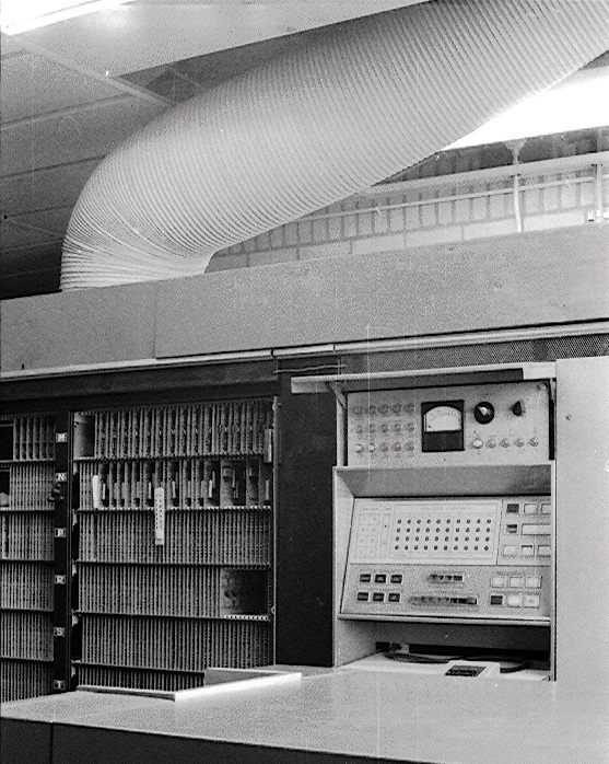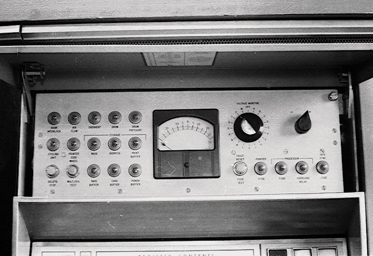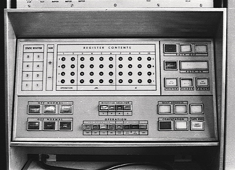 The CPU was about 2.7 meters wide and 1.75 meters high and weighed about 1600 Kg. On the right was the operator-console located. On this console 42 lamps displayed the content of one of the 4 registers. Also there were control-switches which allowed the operator to start and to stop program-execution or to execute a program step-by-step. Underneath the console there was a table with a numerical pad. This pad was the only system to enter instructions or numbers into the registers. Debugging programs was complicated. One had to execute the program step by step, checking the content of the registers as desired. When the operator had to change a number or an instruction in memory, the new number was typed into rA. Then an instruction to store (rA) in memory, was typed into rC and the operator executed this instruction in the one-step-mode to write the word in rA to the desired address.